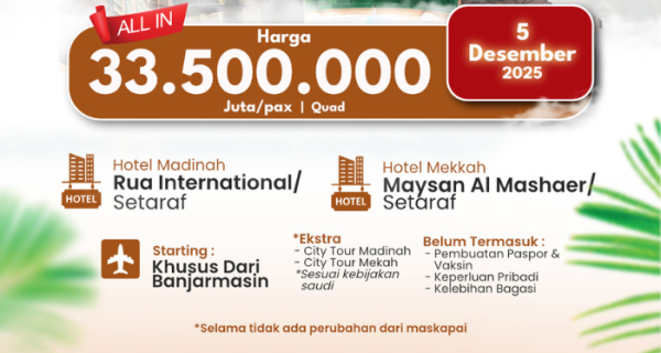 Umrah Landing Madinah murah, nyaman, dan aman kini dibuka 45 seat haja. Harga kada maulang — langsung ke Madinah dulu, perjalanan lebih tenang.